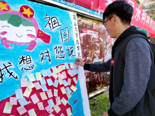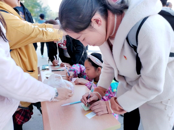 10月29日中午,西雕广场,阳光明媚,微风不燥,活动现场,活动志愿者们热情高涨,积极呼吁广大同学参与到“祖国,我想对你说”的活动中,活动现场无比热闹。一位小朋友也加入了其中,用多张便利贴写下了自己对祖国的无限热爱,并开始帮着志愿者们号召更多的同学加入其中。更有一位骑车拿着大包快递的同学,停下车,走向展板,拿起笔写下自己对祖国的礼赞!活动结束后,在志愿者们精心制作的展板上已贴满一张张便利贴,一字一句书写着对祖国的爱和对祖国美好未来的展望。此次活动的圆满成功,不仅表达出了参与同学对祖国的热爱,同时也感染着更多的同学们,以青春之名,以爱国之心,在祖国七十华诞,抒发对祖国的无限热爱!