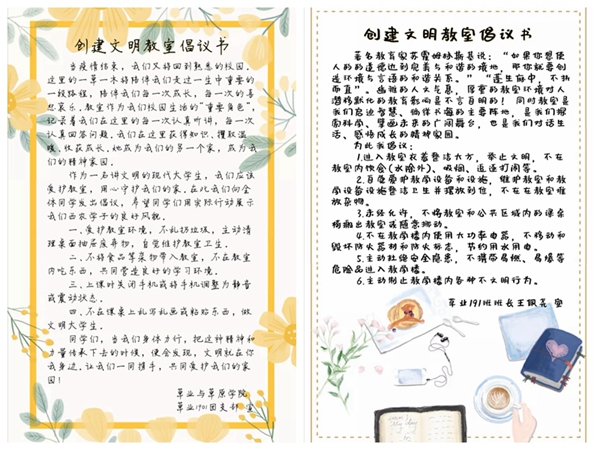 各团支部认真组织学习了《jinnianhui今年会官网文明教室创建实施办法》和《jinnianhui今年会官网文明教室创建工作考评细则》,同学们对文明教室创建目的、意义、内容和要求等方面进行了深入学习和探讨。各团支部还通过制作倡议书,提倡同学们从自身做起,当好教室的“主人”,积极投入文明教室创建工作中。同学们还通过视频、群内接轮等方式纷纷表达要养成良好行为习惯,自觉遵守文明教室创建要求,文明使用公共教室资源等承诺。