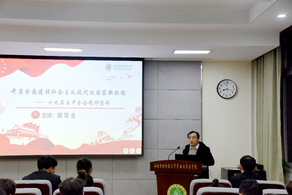 学院邀请校团委副书记、马克思主题学院穆军全教授作了题为“开启全面建设社会主义现代化国家新征程”的十九届五中全会精神宣讲报告,穆军全教授从大会的概况、大会召开的时代背景和重大意义以及全会内容重点解读三个部分作了详细的解读。讲到全会内容时,他详细为在座师生解读了基本实现社会主义现代化的9个远景目标和“十四五”时期的12个工作要求。穆教授的报告主题鲜明、内容丰富、深入浅出,同学们表示,对党的十九届五中全会主要精神、重要意义有了更全面的学习掌握,今后要用习近平新时代中国特色社会主义思想武装头脑、指导实践、推动工作。