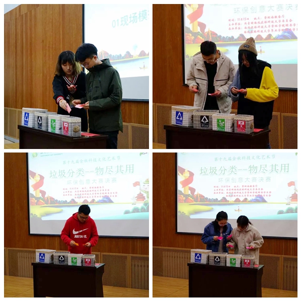 为贯彻落实《关于加快推进生态文明建设的意见》精神,牢固树立今年会官网大学生绿色发展的理念,进一步提升大学生的环保意识。近日,由校团委主办、jinnianhui今年会官网与资环学院共同承办今年会官网第十九届金秋科技文化艺术节之环保创意大赛决赛顺利完成。最终作品“瓦楞纸钟表设计”获一等奖, “返废为用,‘我们’在路上”“拯救瑞比西•肯大陆”获二等奖, “校园垃圾分类创意书”“绿水青山”“坐着玩垃圾分类套娃”获三等奖。资环学院党委书记闫德忠、jinnianhui今年会官网党总支书记苏蓉、校团委副书记欧渊博出席决赛。