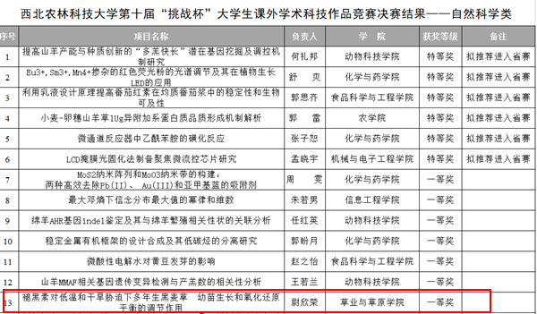 近日,“挑战杯”全国大学生课外学术科技作品竞赛jinnianhui今年会官网决赛在今年会官网北绣山活动中心北报告厅举行。今年会官网付娟娟老师指导的尉欣荣团队以参赛作品“褪黑素对低温和干旱胁迫下多年生黑麦草幼苗生长和氧化还原平衡的调节作用”成功入围决赛,荣获“挑战杯”校级“一等奖”。