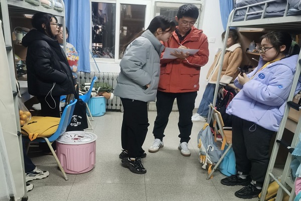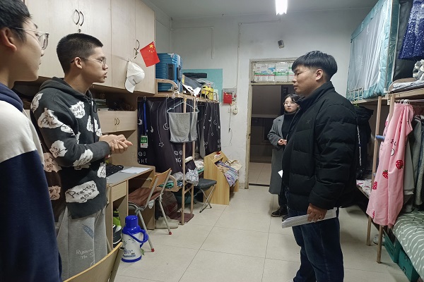 为加强学生日常管理,创建文明和谐、干净整洁、安全的宿舍环境,12月8日晚,学院全体辅导员、学生干部深入本科生、研究生宿舍进行走访检查。
