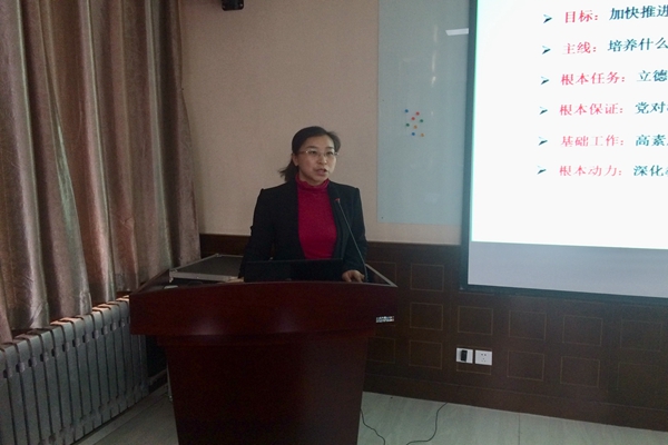 闫祖书围绕“贯彻全国教育大会精神,落实立德树人根本任务”这一主题,从党的十八大以来,有关教育的重要论述、全国教育大会的核心要义、如何落实立德树人根本任务为主要内容,以习近平总书记在全国高校思想政治工作会议上的讲话、在党的第十九次全国代表大会上的讲话、在北京大学师生座谈会上的讲话、在全国宣传思想工作会议上的讲话为引子,详细介绍了全国教育大会召开的背景及重大意义,分析概括了召开全国教育大会的目标、主线、根本任务、根本保证、基础工作以及根本动力,并以学校学院相关案例深入讲解了“九个坚持”“六个下工夫”“四个服务”的内涵。