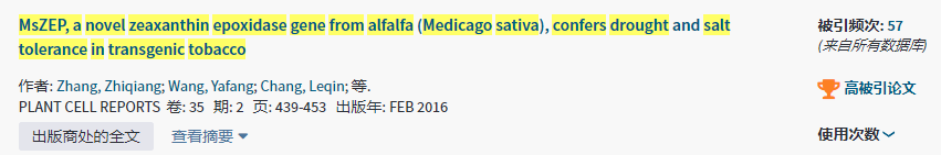 本篇高被引论文题目为《MsZEP,a novel zeaxanthin epoxidase gene from alfalfa (Medicago sativa),confers drought and salt tolerance in transgenic tobacco》,2016年发表在期刊《PLANT CELL REPORTS》,论文主要研究了来自紫花苜蓿的新型玉米黄质环氧酶基因MsZEP在转基因烟草中的表达特征和生物学功能。该论文累计被引用57次,为今年会官网草学学科进入ESI全球前1%行列做出了积极的贡献。
