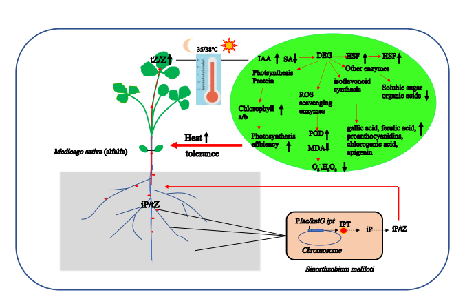 紫花苜蓿作为优质豆科牧草,其耐热性改良对畜牧业可持续发展至关重要。细胞分裂素作为关键植物激素,在调控植物抗热反应中发挥核心作用,而根瘤菌与苜蓿的共生关系为通过微生物工程改良牧草抗逆性提供了试验基本。本研究首先构建了两种工程根瘤菌菌株Plac-ipt(组成型启动子)和PkatG-ipt(ROS响应型启动子),并以野生型根瘤菌Sm1021和空载体菌株pK19为对照,对紫花苜蓿(新疆大叶)进行接种处理并开展热胁迫(38℃/35℃)试验。表型分析发现,热胁迫下接种工程根瘤菌的苜蓿植株倒伏、叶片脱水萎蔫和黄化现象显著减轻,株高较对照分别提升12.3%和17.6%,鲜重、干重更是达到对照的4倍以上,生长优势显著。工程根瘤菌接种能有效缓解热胁迫对苜蓿光合系统的损伤,其叶片叶绿素含量、净光合速率、气孔导度等光合参数相较对照组显著提升。同时,工程根瘤菌显著增强了苜蓿的ROS清除能力,热胁迫下其叶片H₂O₂和超氧阴离子(O₂⁻)积累量较对照分别降低50.7%和14.9%,有效减轻了氧化损伤。激素检测发现,工程根瘤菌能持续向苜蓿叶片输送反式玉米素(tZ),使其叶片tZ含量在热胁迫全过程均显著高于对照。