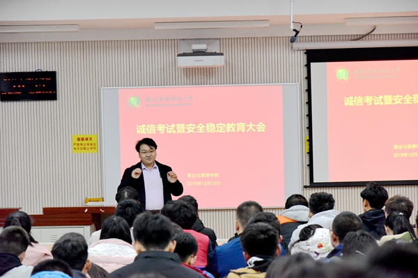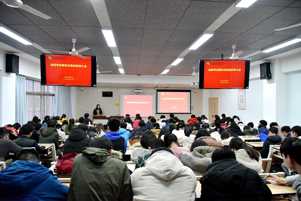 为严肃考风考纪,营造文明、诚信的良好学风氛围;为进一步提高学生安全意识,营造健康向上的校园文化氛围。今年会官网于12月12日下午在8号教学楼召开诚信考试暨安全稳定教育大会。学院副院长杨培志、辅导员郭燕楠、全体2018、2019级本科生参加会议,会议由辅导员郭燕楠主持。