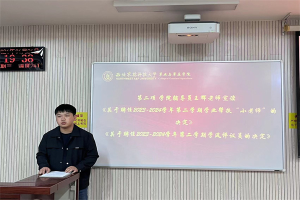 学院团委副书记王辉老师宣读《关于聘任2023-2024学年第二学期学业帮扶“小老师”的决定》以及《关于聘任2023-2024学年第二学期学风评议员的决定》。